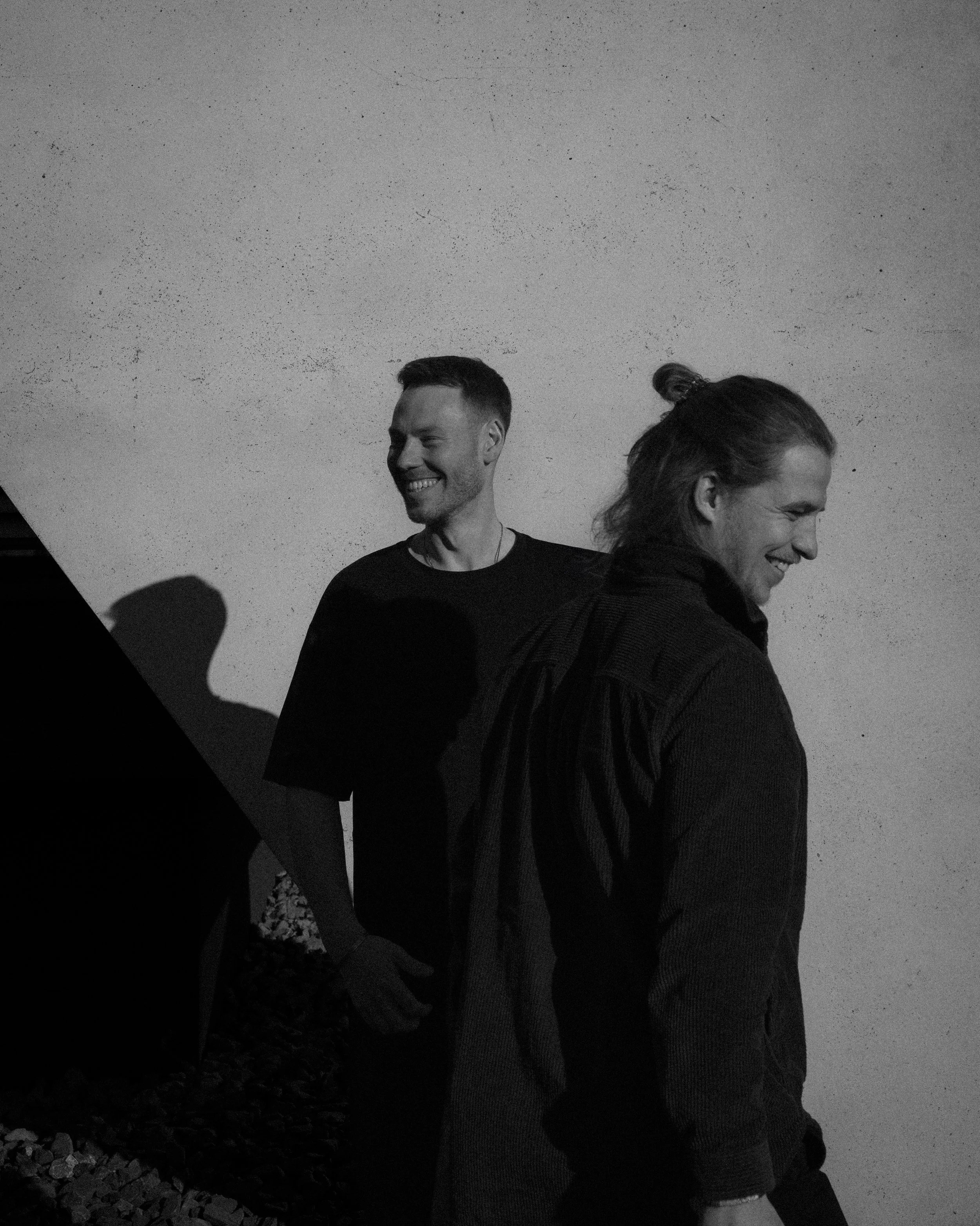 Schwarz-Weiß-Foto von zwei lächelnden Männern vor einer Wand, einer trägt einen Zopf.