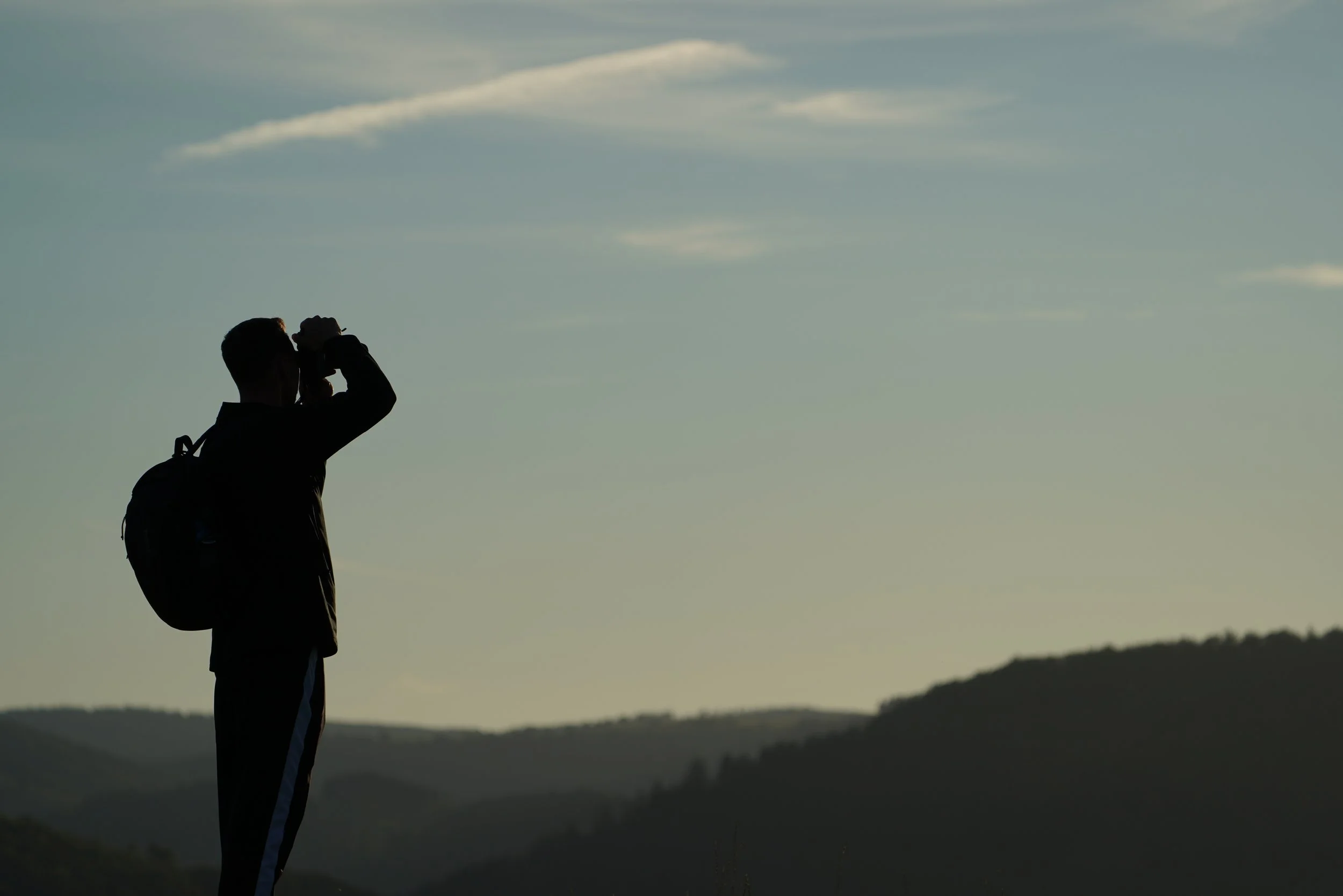 Silhouette einer Person mit Rucksack, die Fernglas benutzt, mit Berglandschaft im Hintergrund.