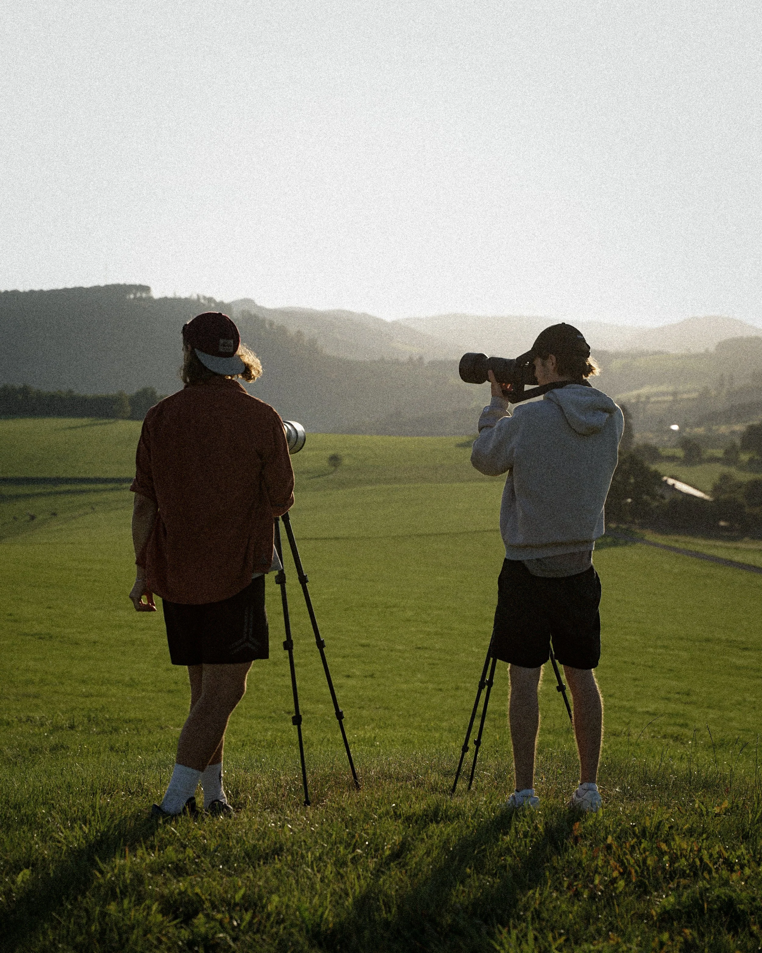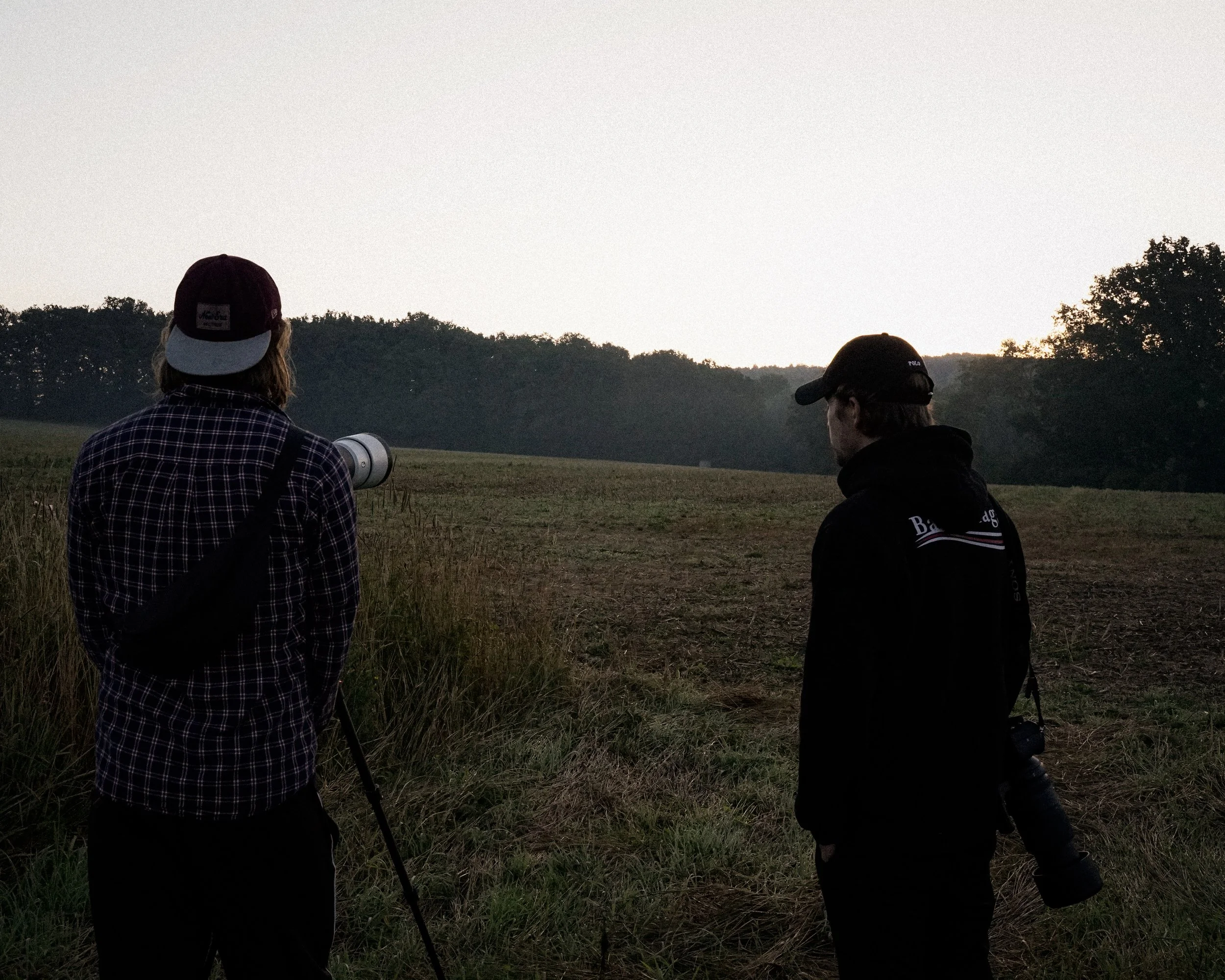 Zwei Personen stehen auf einem Feld bei Sonnenaufgang, beide tragen Baseballkappen und haben Kameras mit großen Objektiven dabei. Sie blicken in die Ferne, umgeben von Gras und Bäumen im Hintergrund.