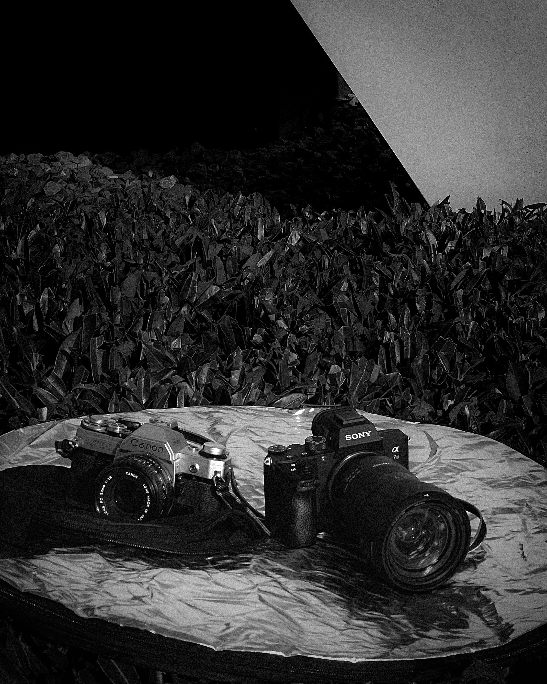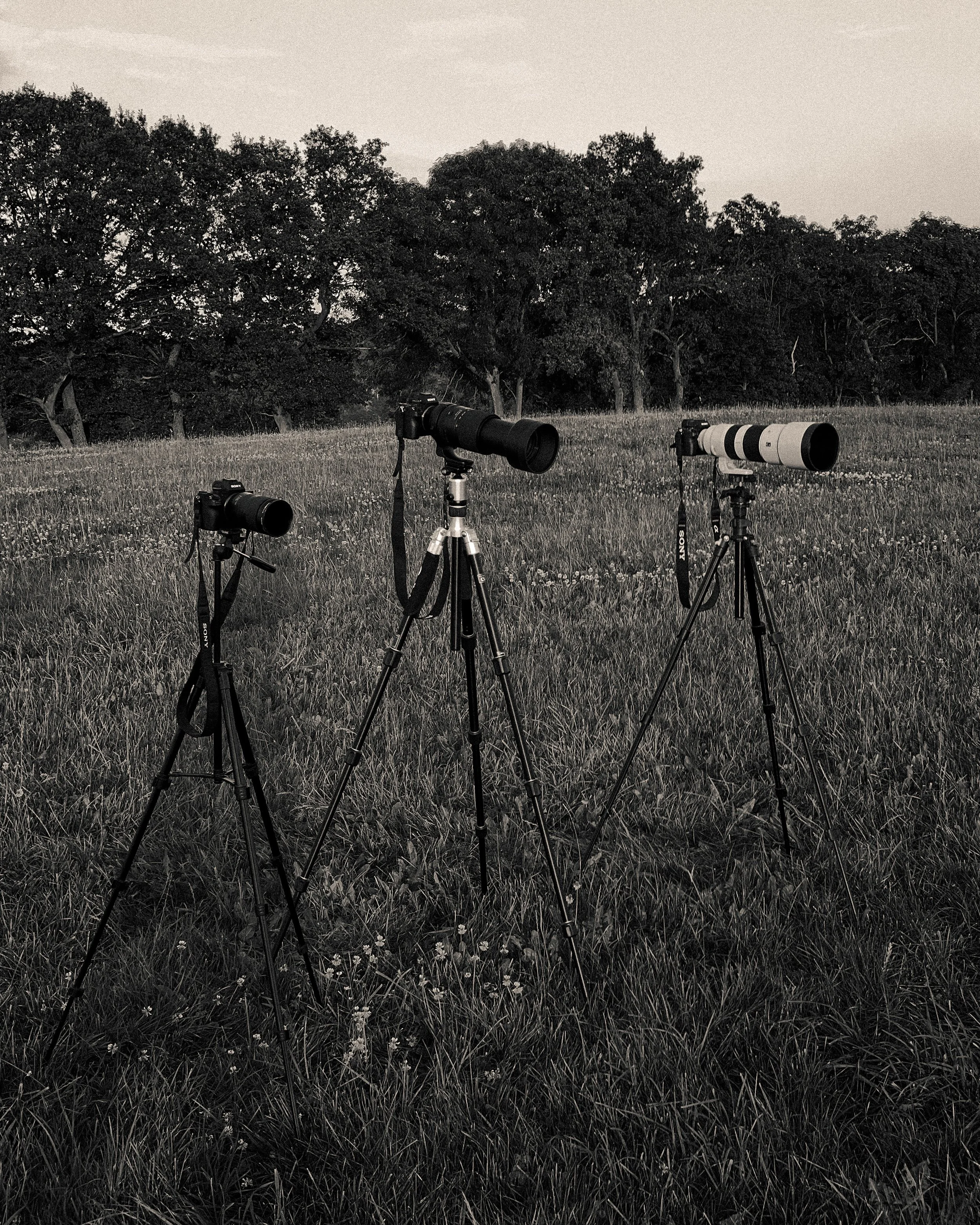 Drei Kameras mit langen Objektiven auf Stativen stehen auf einem Feld. Im Hintergrund sind Bäume zu sehen. Die Aufnahme wirkt in Schwarzweiß.