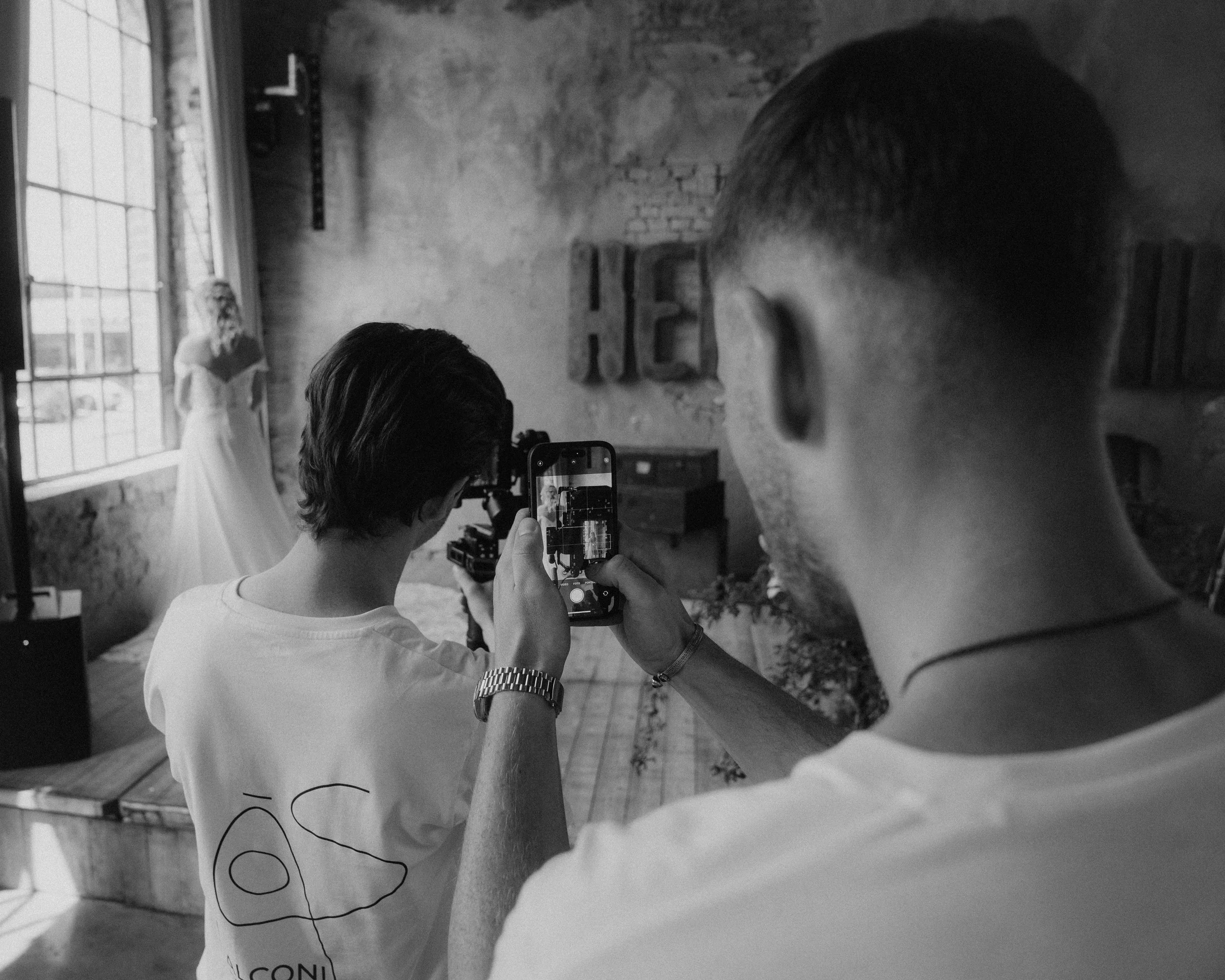 Person mit Kamera in modernem, minimalistischem Flur mit großen Fenstern und dekorativer Beleuchtung in Schwarz-Weiß.