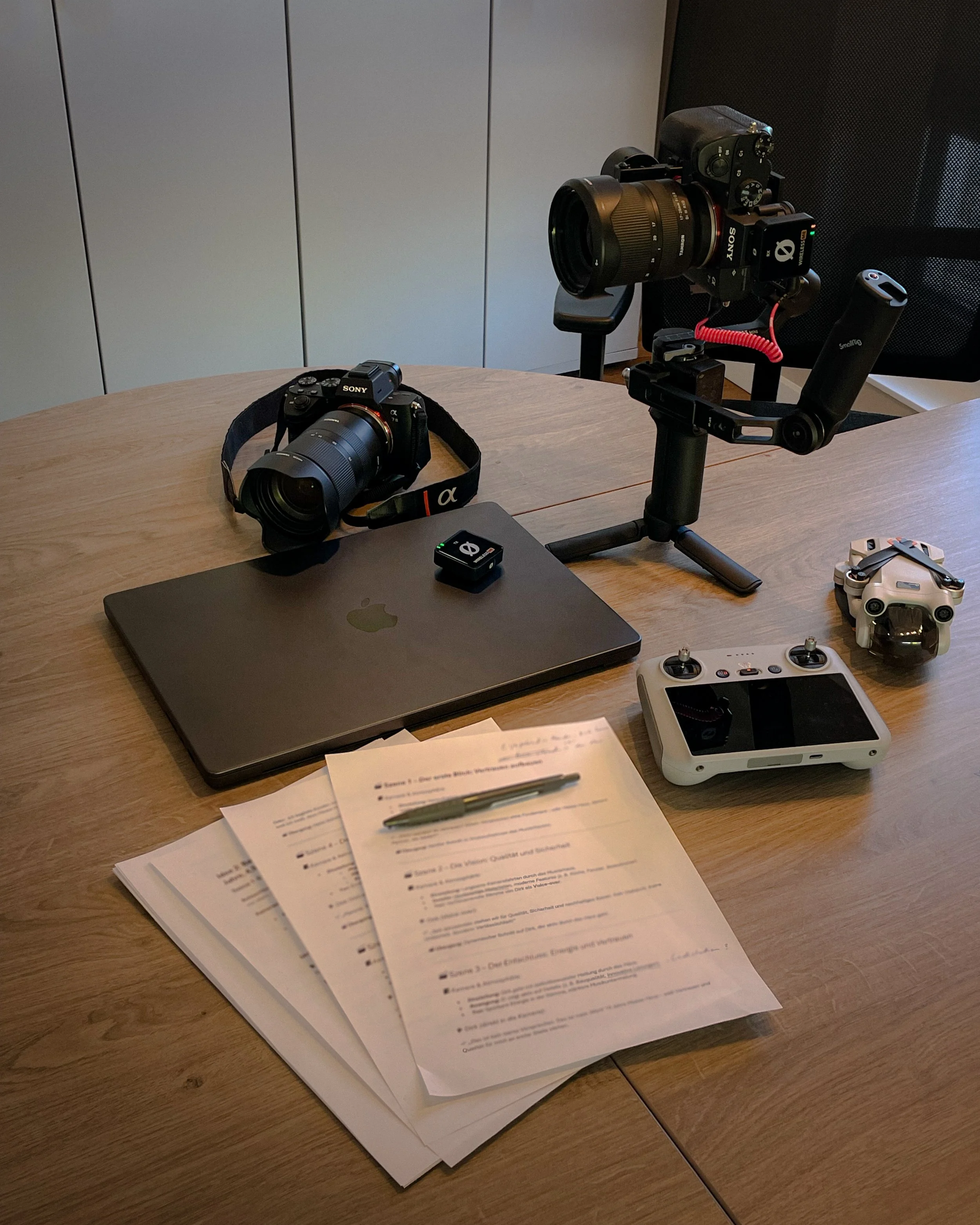 Mann in einem Korridor mit grauem Fliesenboden, der eine Kamera auf einem Gimbal hält. Er trägt einen schwarzen Pullover, helle Hose, eine schwarze Mütze und Turnschuhe. Die Wände sind hell mit Wandleuchten ausgestattet.