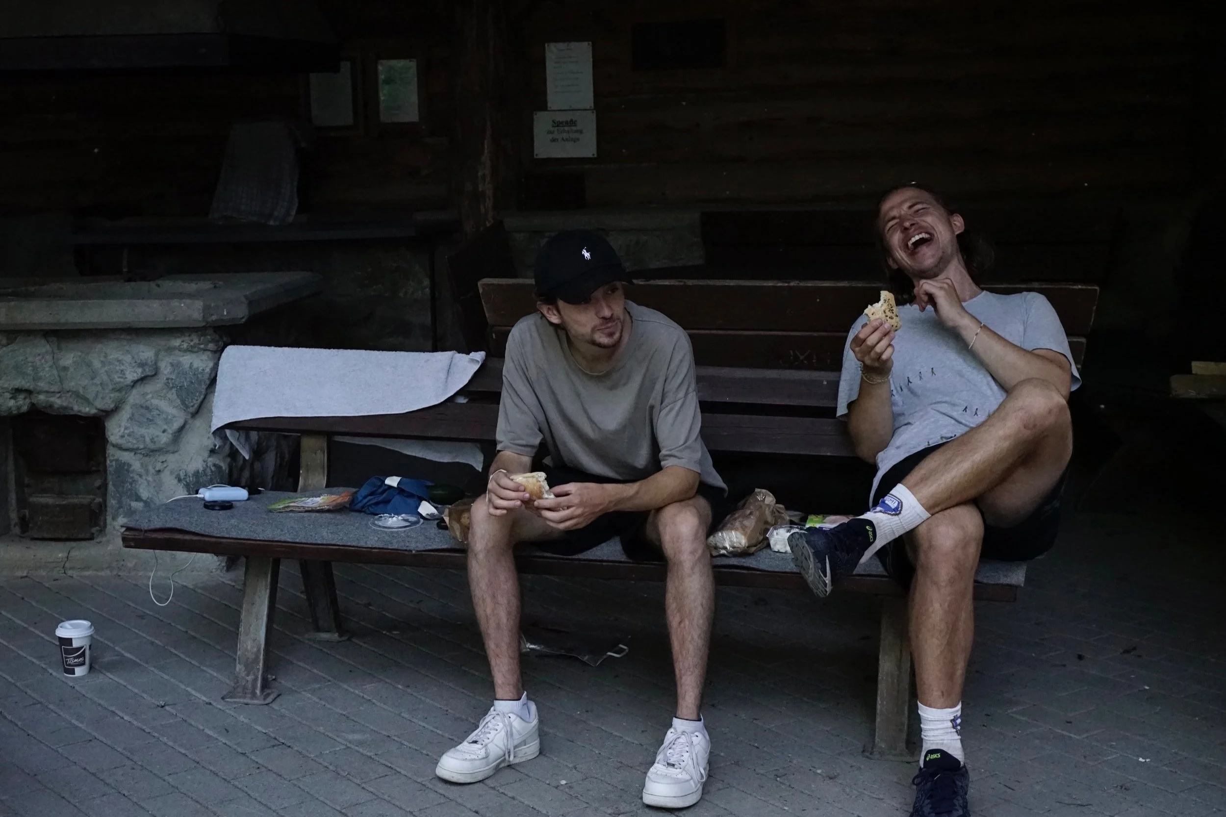 Zwei Personen sitzen auf einer Bank und essen Snacks, umgeben von Gegenständen wie einer Tasse und Kleidungsstücken. Die Umgebung sieht aus wie eine überdachte Außenanlage mit einem Kamin im Hintergrund.